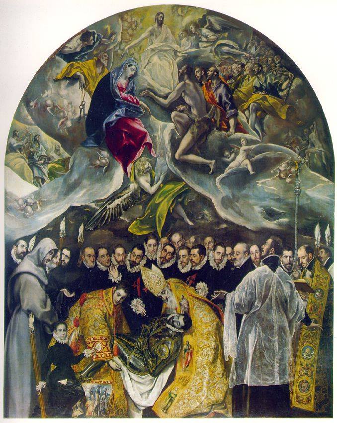 "Tal galardón recibe quien a Dios y a sus santos sirve". Esta frase murmurada entre dientes por los prestes que ofician las exequias, san Agustín revestido de capa pluvial y mitra de obispo y san Esteban con la dalmática diaconal, sirve para poner música de fondo a la escena que da marco al entierro del conde Orgaz, lienzo donde se estampa con auténtica veracidad una de las páginas más realistas de la historia de España y un cuadro de costumbres. El Greco junto a Velázquez es pintor poco decorativo. Ambos buscan el alma de las cosas y su arte es el arte de la síntesis. Con tales mimbres que servirán de materia prima de lo sublime [una leyenda local consistente en las mandas que dejara a una iglesia de la ciudad, la de santo Tomé: unas cántaras de vino, unas cargas de leña, unas hogazas de pan a los pobres, y algunas monedas para misas gregorianas] se enhebra el enternecedor milagro.