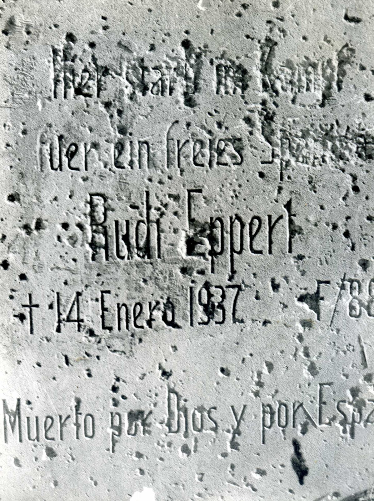 Ewig erinerung fur RUDI EPPERT. fUE EL PRIMER CAÍDO EN LA BATALLA DE LA SED (VER MI LIBRO "REMEMBER BRUNETE. HABÍA UNA ESTELA FUNERARIA DE MARMOL EN EL LUGAR EN QUE CAYÓ SU APARATO EL 14 DE ENERO DE 1937. EL ALCALDE SOCIALISTA DE VILLANUEVA DEL PARDILLO LA MANDÓ DETRUIR. ERA SU MEMORIA HISTÓRICA NO LA NUESTRA