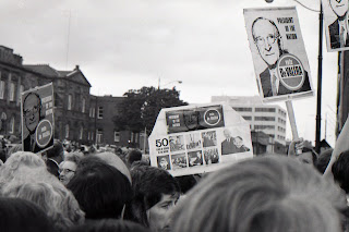 In Dublin fair city where the girls are so pretty... los que amamos a Irlanda hoy estamos de funeral pensando en los miles de infantes no nacidos trucidados en el vientre materno. La guadaña de la muerte sube en la carretilla de la dulce pescadera de pelo rojizo y ojizarca a la que amamos y cantamos en nuestra juventud. Eire se ha hecho abortista unciéndose al carro de heno de los que niegan la vida en esta Europa crucifija en el palo a la que le han subido toda esa gentuza jarca infernal de los que promulgan los derechos humanos y niegan el derecho a nacer. Las aguas del Liffley el río de Dublín el río más literario del mundo bajan turbias, tintas en sangre de los cadáveres del gran infanticidio. Es el río de Joyce, de Swift, de Erskine, de Bernard Shaw, de Keats. Cantábamos dulces baladas en las barras de Main Street al son del banjo y empapados de Guiness. Mientras, Molly Mallone empujaba la carretilla cargada la cesta de berberechos y mejillones. La pescaderita murió joven el año del hambre cuando se arruinó la cosecha de patatas. Durante mis años ingleses viajaba con frecuencia a la Irlanda mítica a ver las cruces de san Patricio y me encontré pecios de la Invencible. En County Cork hallé un pueblo de gente bajita y morena que se ufanaba de ser descendientes de un galeón de la Armada que se hundió durante una galerna. Los supervivientes del naufragio casaron con mozas de allí. Irlanda es eufónica y torrencial como la música del violín. El gaélico materno que hablaba en la vieja Erín los celtas fortaleció al inglés y es un venero de poesía que recorre por las venas de la literatura inglesa. Nunca entendí el conflicto del Norte pero estuve en un mitin en el cual hablara De Valera por última vez. Fue en la primavera de 1973 y aquí van las fotografías que tomé y que se publican por primera vez. Creo que a partir de hoy Irlanda ha dejado de ser católica.